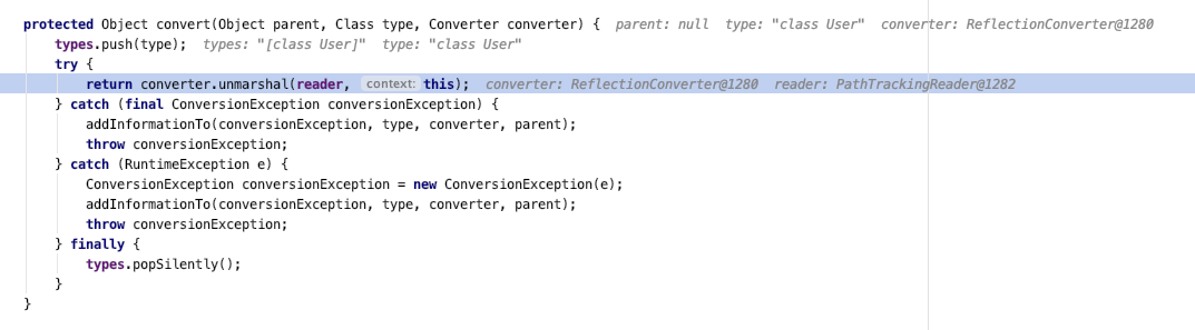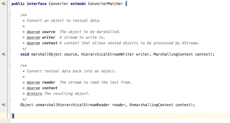 与传统的Java反序列化不同,XStream反序列化的触发不依靠readObject,而是使用Converter(转换器)中的unmarshal。而Converter根据源码的注释,其用途为对象与xml文本之间的相互转换。