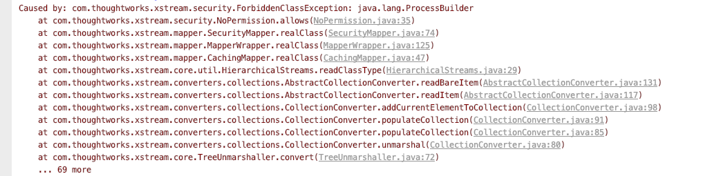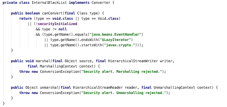 因此XStream官方的修复方式为,实现了一个类为InternalBlackList(黑名单转换器),当属性值为java.beans.EventHandler时,抛出异常,因此基于该类型的poc均失效