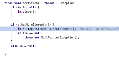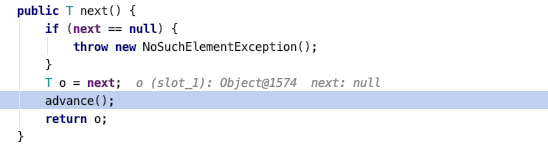 而javax.swing.MultiUIDefaultsEnumerator类的nextElement,会调用自身迭代器的next函数,其next函数中额外调用了advance函数
