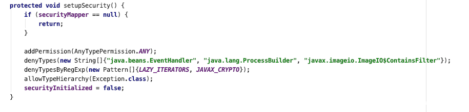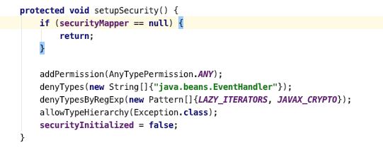然而框架本身并未提供任何默认策略,需要用户手动调用addPermission进行配置,因此,在1.4.13之前的版本,其防御手段都是依靠修改Converter,包括InternalBlackList和ReflectionConverter,在转换时将其拦截。在1.4.13中,默认加入了EventHandler的黑名单