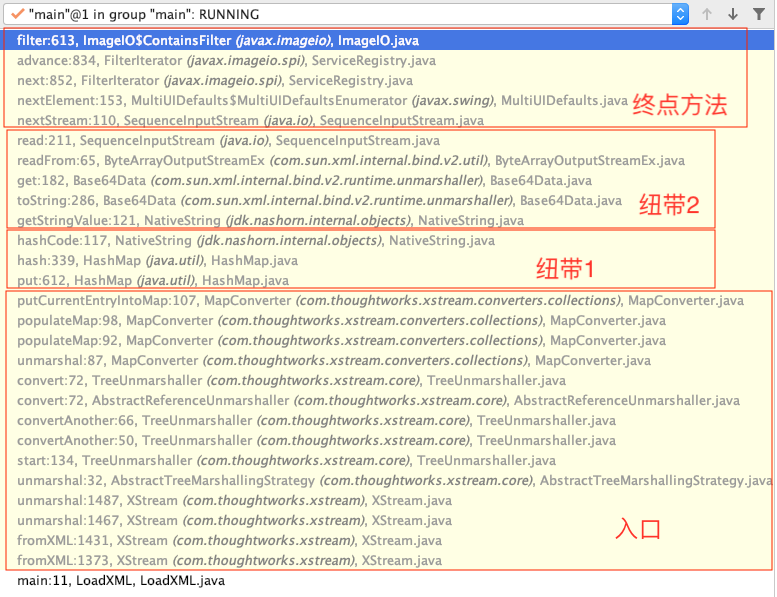 可以看到,传入的XML文本(转换为reader),被传递到了填充map的函数中,进一步跟进,流程走到了putCurrentEntryIntoMap函数中,该函数的作用为将对应的key和value(从XML中解析,对应POC中的<jdk.nashorn.internal.objects.NativeString>和<string>)放到HashMap中,由此触发HashMap的put方法,进入纽带1阶段