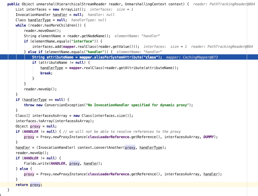 在XStream过往的漏洞中,利用的核心为DynamicProxy类和EventHandler类,当存在dynamic-proxy标签时,会使用DynamicProxyConverter进行unmarshal,该操作会构造一个由用户指定handler的对应代理对象。