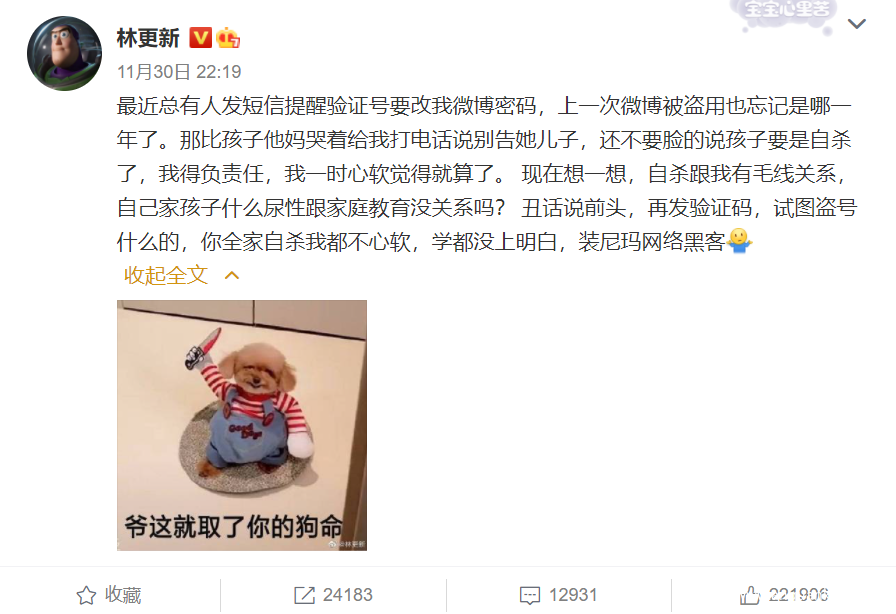 本周一,演员林更新发布微博,怒气冲冲地控诉盗号党的下作行为。