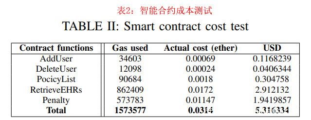 为了评估智能合约在我们的医疗系统中的性能,我们调查了当我们的Ethereum区块链上有5个移动用户时合约功能的操作成本,如表2所列。成本以Gas为单位计算,然后以本研究时1Gas≈0.00000002 Ether,以及1 Ether≈169.31美元的汇率换算成以太(以太坊区块链的成本单位)和美元。我们考虑的是一个现实的场景,一些新用户可以加入医疗网络,一些现有用户可以离开,因此需要执行AddUser和DeleteUser函数。此外,合同还可以允许用RetrieveEHRs对授权用户进行数据检索,或用Penalty对未授权用户进行强制处罚。这些合同的执行都会产生操作成本,用户需要为其他们的服务使用付费。由表2可知,共享服务的Gas量为1573577 gas(即5.316334美元,≈1.063美元/用户)。显然,使用我们的合同所需的财务成本很低,这表明了所提出的基于合同的数据共享计划的实用性。