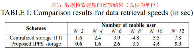 此外,我们还研究了数据共享的时间开销,如表1所示。多个MD可以同时访问IPFS存储进行数据检索,并测量时间延迟。特别是,我们将我们设计的去中心化IPFS存储与利用传统中心云存储进行共享的基线[11]进行了比较。实验结果清楚地表明,在IPFS云区块链上提出的去中心化存储方案与传统的中心化存储方案相比,时间开销明显减少。例如,与基线相比,在6个用户和12个用户的情况下,所提出的方案可以分别节省17%和30%的云端数据检索时间,这说明所提出的基于IPFS的存储方式具有明显的优势。