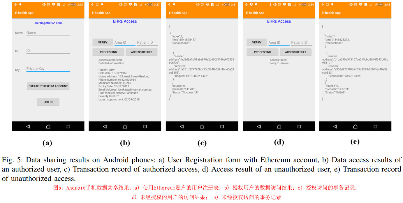 我们给出了授权和未授权访问的两个用例来评估访问控制,如图5所示。目标是让终端用户能够有效检索云上的EHRs,并防止我们的云数据上的恶意访问。移动用户,即医生,如果想在云端访问病人的电子病历,可以使用Ethereum账户注册用户信息,以便加入区块链(见图5(a))。当他的请求被云端EHRs管理器验证后,他立刻开始通过提供病人的地址(包括卸载方案中定义的AreaID和PatientID)进行访问EHRs的事务,如图5(b)所示然后,我们的共享系统会返回数据访问结果,这些结果也会在他的手机界面上更新(见图5(b))。因此,医生可以从用药的卸载阶段计算出的患者伤残等级(分数)。当EHRs访问过程结束后,通过挖矿过程将新的事务追加到区块链中,并广播给所有参与者。因此,患者可以监控共享事务,并知道谁使用了他们的数据(图5(c)),从而确保用户数据的所有权和网络可信度。