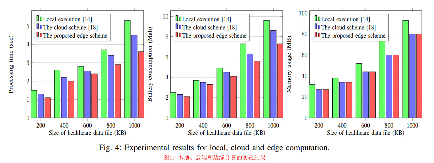 对于处理时间,包括本地用例的执行时间和加密时间,云和边缘情况下的卸载时间和远程执行时间。从图4的结果可以看出,所提出的边缘方案在平均处理时间方面性能最好。例如,通过边缘方案执行一个200KB的文件只消耗1.1秒,而在云端和本地方案中分别需要1.3秒和1.5秒左右。这样一来,利用边缘计算可以节省10-18%的数据执行时间。此外,与本地方案和云方案相比,所提出的边缘方案在计算一个1200 KB的文件时,分别节省了高达31%和15%的时间。通过选取的人体运动数据集,我们还发现,虽然在卸载中集成了数据加密,但边缘云卸载方案仍然比本地方案取得了更好的卸载性能,显示了所提出的加密技术的效率。