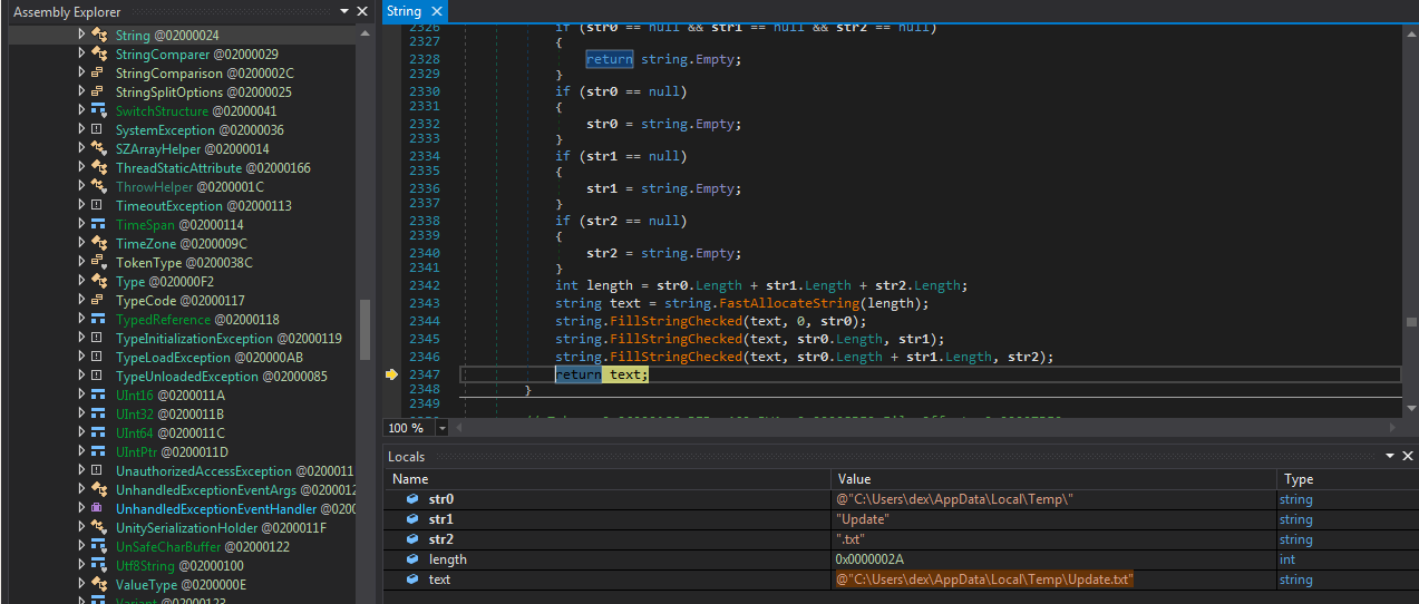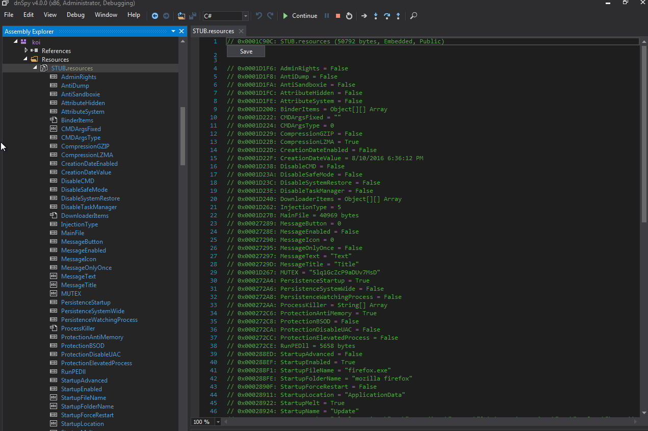 恶意软件会检查当前运行路径是否与配置信息中的Startup目录相匹配(如%AppData%mozilla firefoxfirefox),如果不匹配,则会将自己复制到Startup目录中,然后通过cmd.exe来启动。这意味着我们需要停止调试,从%AppData%mozilla firefoxfirefox目录中将firefox.exe载入dnSpy,然后再次跟进解包过程,直到到达目前位置。