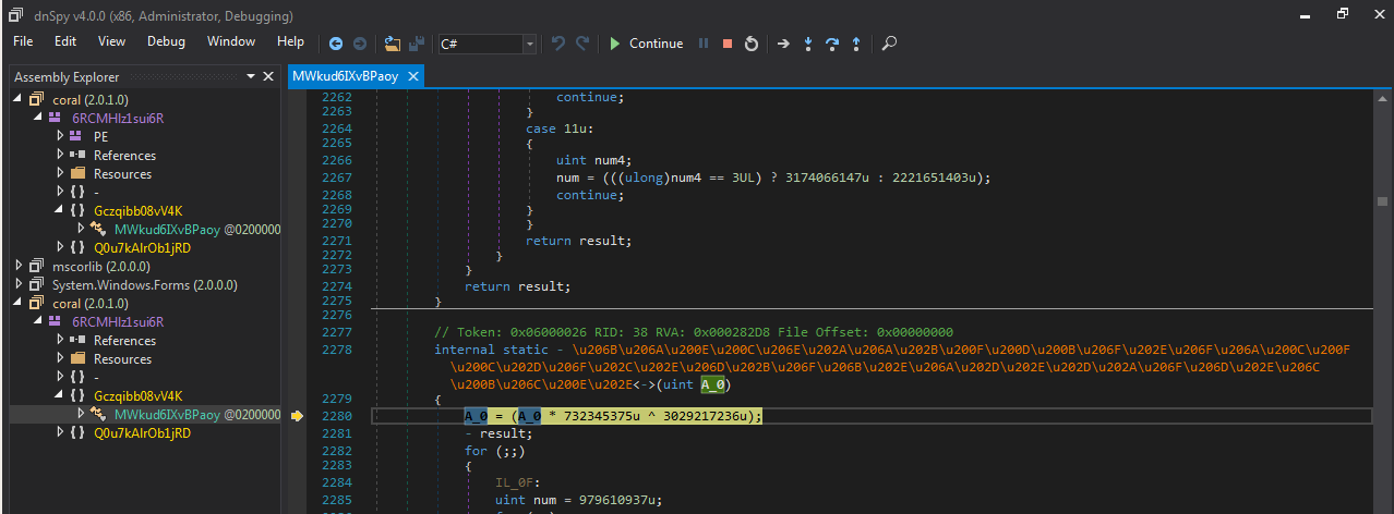 恶意文档使用了常见的恶意软件技术(比如嵌入VB代码)来释放.NET可执行程序。在本文中我们不会介绍这些技术,主要关注的是.NET恶意软件释放器(dropper)的去混淆过程。恶意软件作者使用自定义的ConfuserEx对释放器做了大量混淆处理(ConfuerEx是一款免费的.NET Framework混淆工具)。如果我们直接使用类似dnSpy之类的.NET反编译器来读取这个文件,结果并不理想(图1):