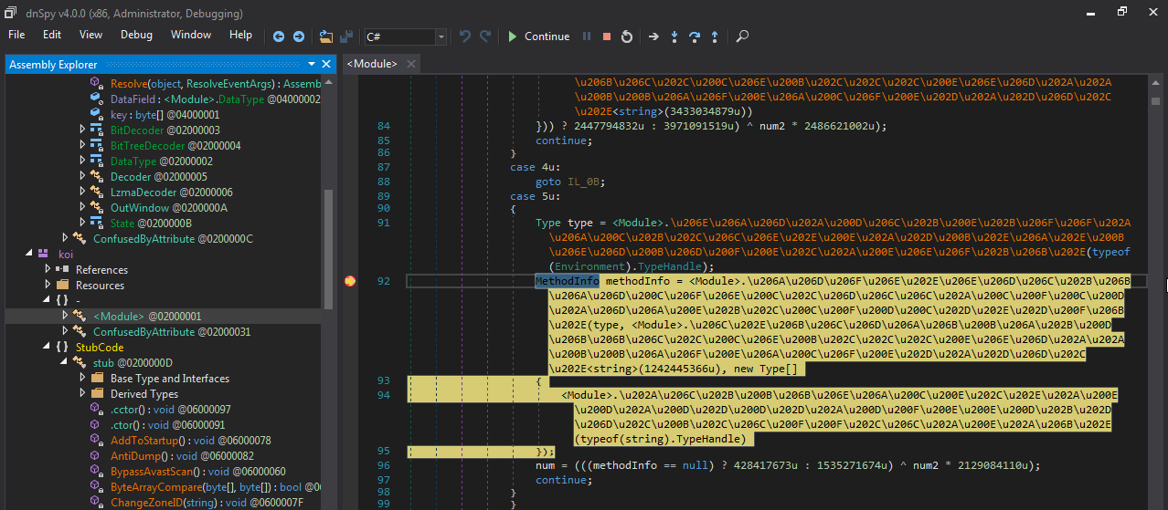 非常好,又解开了一个DLL,不幸的是这个DLL并不重要。我们的Main类以及stub(存根类)中的大多数成员仍然为空。单步跟进后,我们再次回到<module>。分析这些方法后,我们可以在第92行设置断点,观察下一阶段的解包过程(图10)。