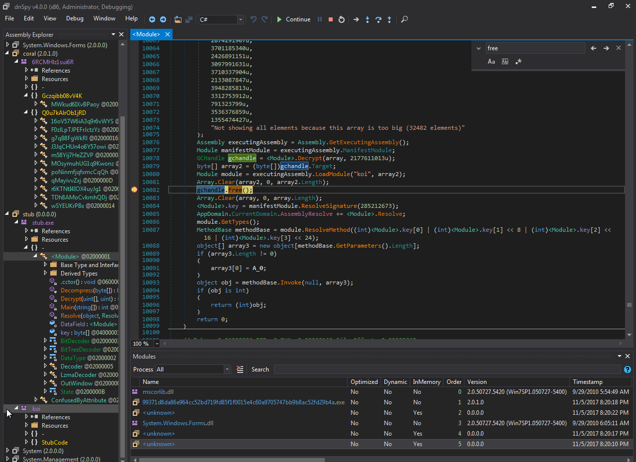 如果你之前分析过经过ConfuserEx处理的程序,你会觉得这个画面非常眼熟。事实上,如果你仔细观察,你会发现10082行有一行非常熟悉的代码:gchandle.free()。我们可以在这一行上设置断点。在之前版本中,这行语句是解包过程的最后一行语句。