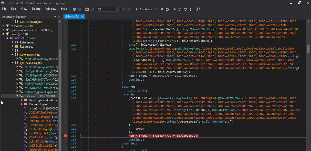分析这阶段载荷后,我们可以在113行的qMayiwZxj类上设置另一个断点,如图4所示:
