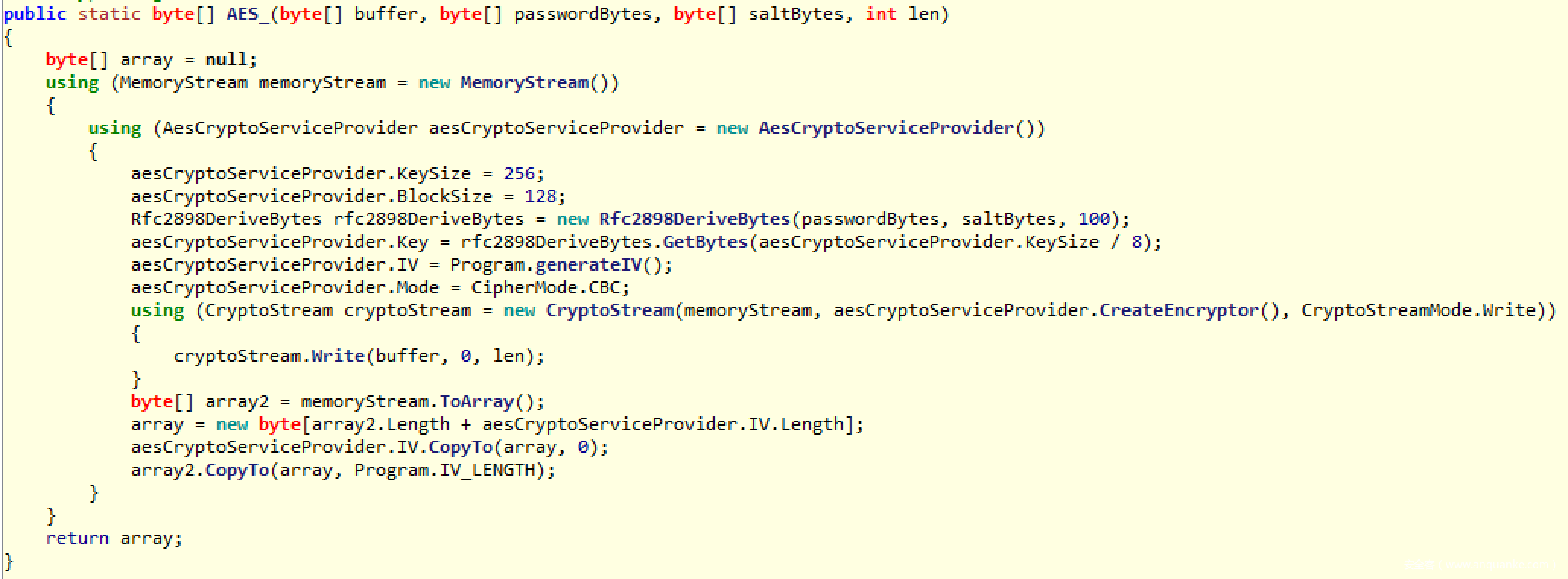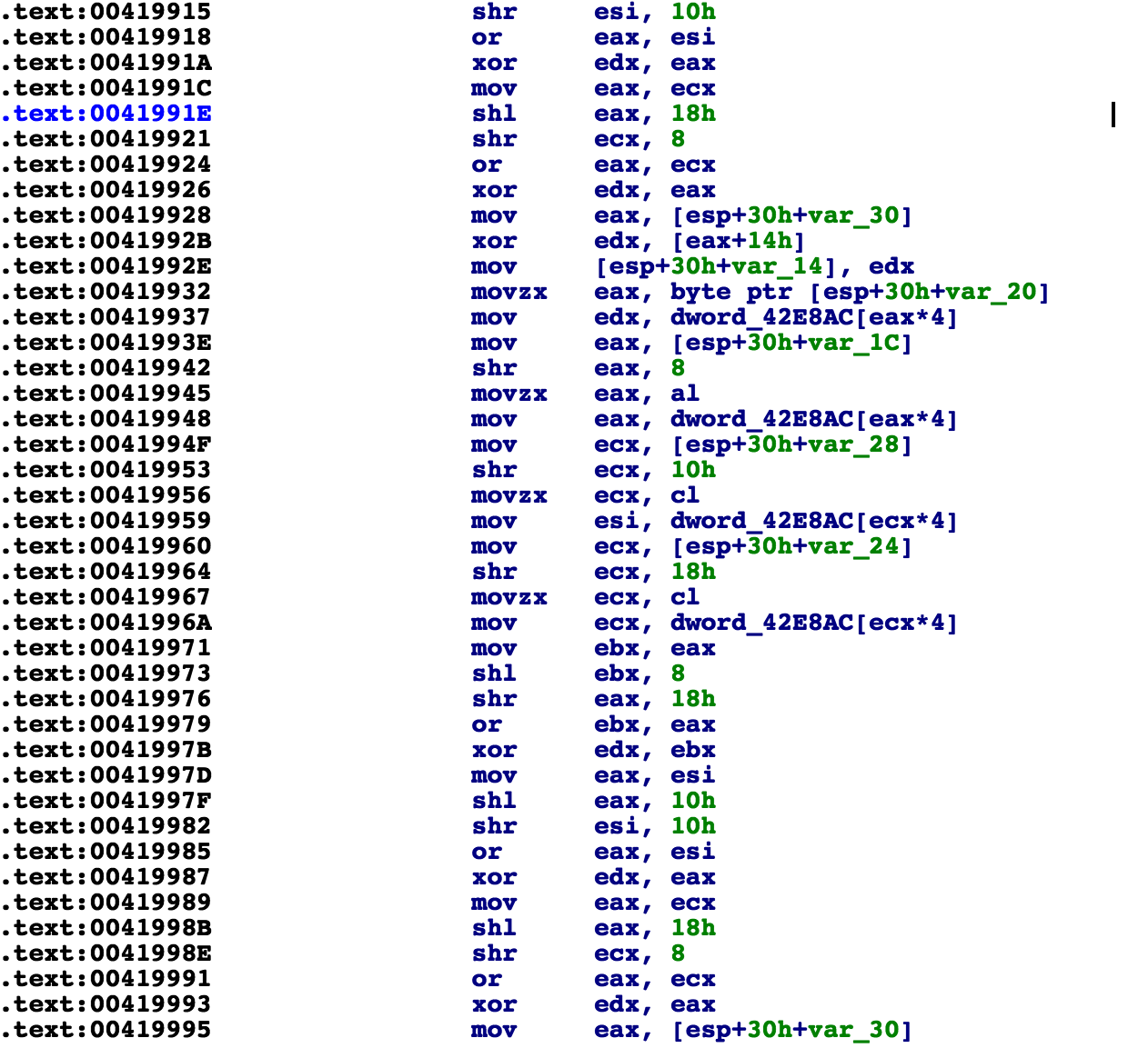 AES可以进行10-14轮运算,这也就意味着当你在查看代码中的加密算法时,它将会是一个拥有非常多重复代码的函数,这一点可以帮助你快速定位到加密代码的所在位置。