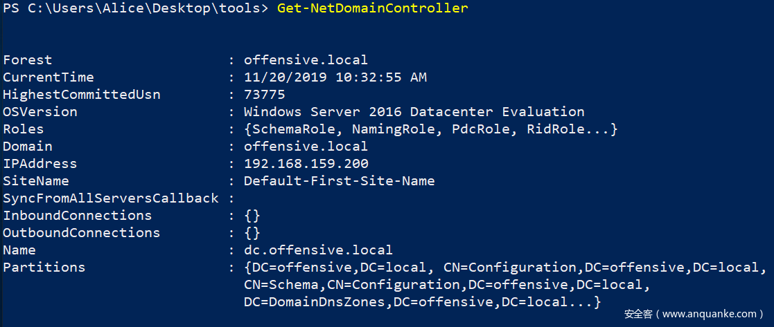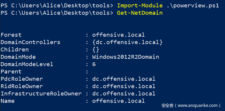 接下来使用powerview进行域枚举,获取域和域控制器的信息: