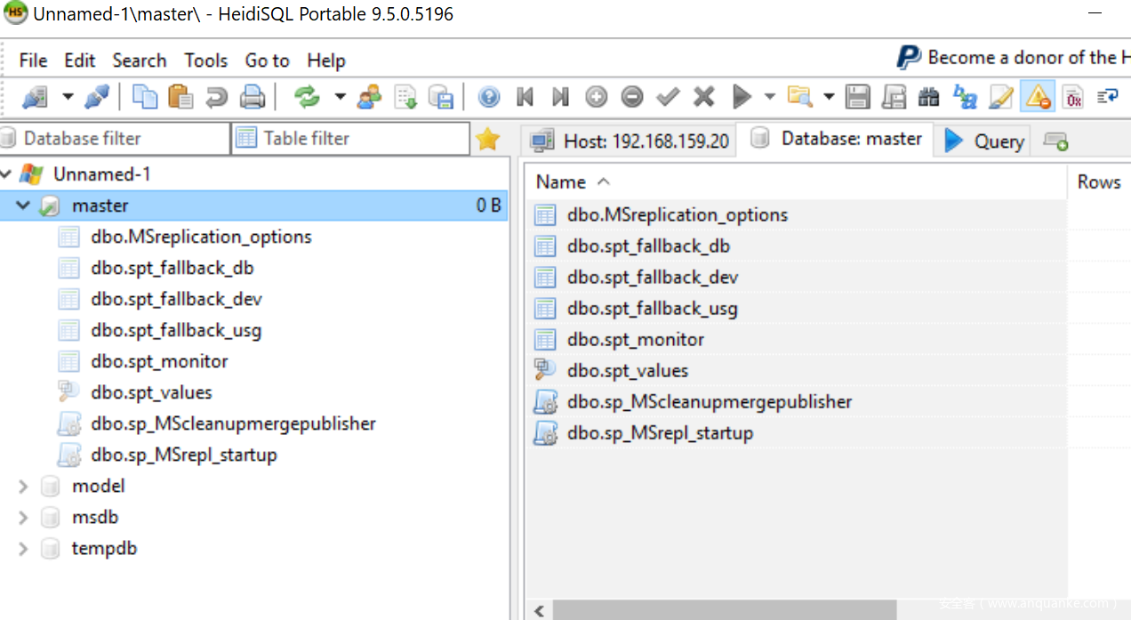 然后我们发现我们可以去登录SQL SERVER那台主机之后,我们便可以使用HeidiSQL去使用windows auth去连接mssql了