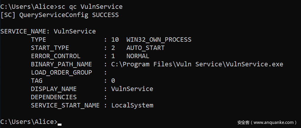 PS C:UsersAliceDesktoptools> sc qc VulnService