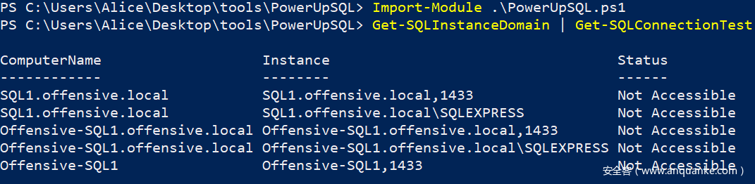 PS C:UsersAliceDesktoptoolsPowerUpSQL> Get-SQLInstanceDomain | Get-SQLConnectionTest