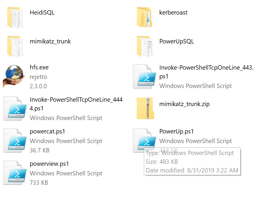 然后我们使用powercat接受一个shell回来,里面自带的Invoke-PowerShellTcpOneLine_443就是返回一个shell给我们的clinet这个主机,那么我们便使用hfs搭建一个简易的web服务器,使用powercat监听443端口,然后使用mssql调用xp_cmdshell去调用powershell去下载那个脚本然后返回一个powershell给我们这个客户机