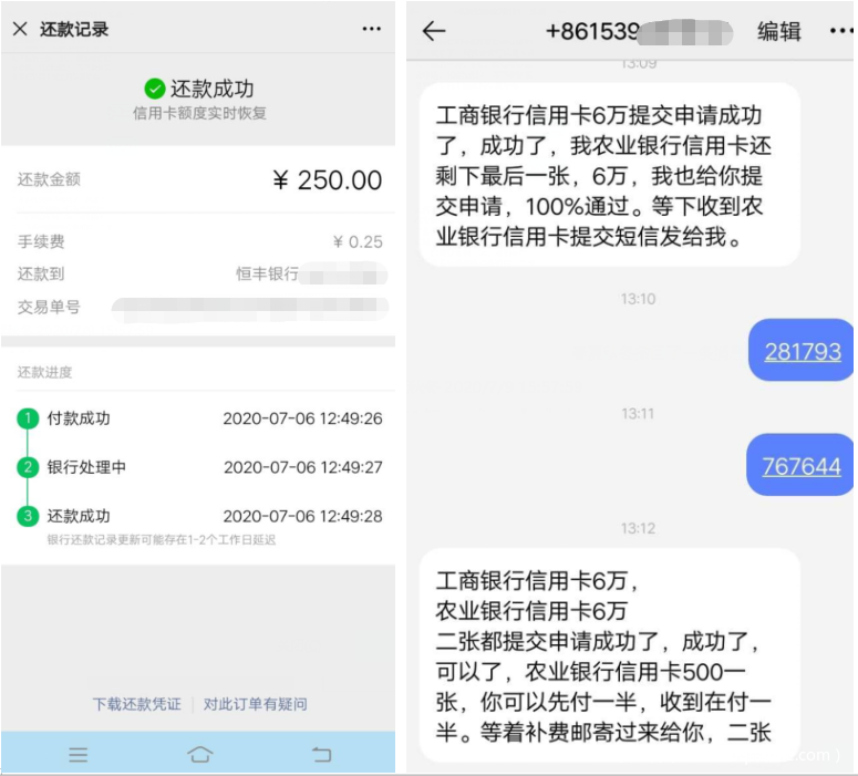 对方以交纳(工商)信用卡办卡费为由,索要了用户收到的信用卡办理短信。用户通过微信“信用卡还款”的方式,向对方指定的银行账户“还款”,并向对方提供了收到的信用卡办理申请的短信验证码。