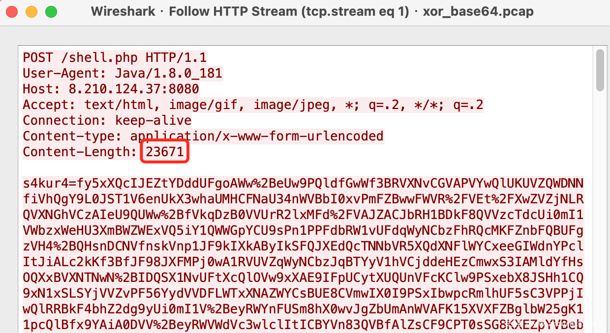 跟踪http流,发现3个http包处在同一TCP中,说明哥斯拉使用了TCP长连接,这对流量特征分析比较有利。对这3个http包逐个分析一下。