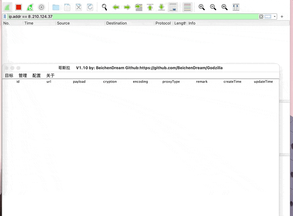 如何寻找哥斯拉的流量特征呢?最先想到的是先前冰蝎的捕获经验,即在shell的建连初期出现的强特征。至于HTTP头部的UA等特征,由于其易被改变,因此暂不考虑。开启Wireshark设置过滤条件,重新打开哥斯拉客户端并添加生成的shell: