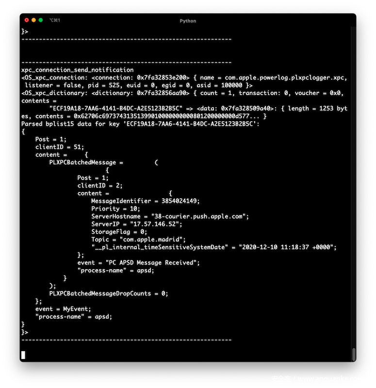 其次,在找到最重要的ObjC方法之后,可以归结为向某个系统进程/守护进程发送XPC消息。我为这个任务编写了另一个工具-【xpcspy】,它可以拦截XPC消息并启用过滤。