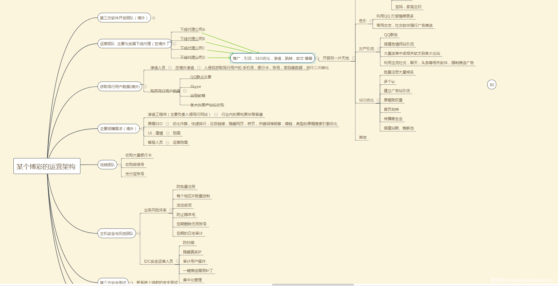 图中是某个博彩公司的运营架构图,我们可以直接看出,一个成熟的博彩平台是由多个产业链参与并聚集而来,技术开发、线上客服、线下推广代理等多种职能人员,并且重视网站和APP的安全,从主机安全到业务安全中的风控都已在博彩中得到应用且实现,核心团队一般都在境外,东南亚地区居多,博彩团队麻雀虽小五脏俱全,这个行业已形成规模化、集团化、分工细分化等特点。