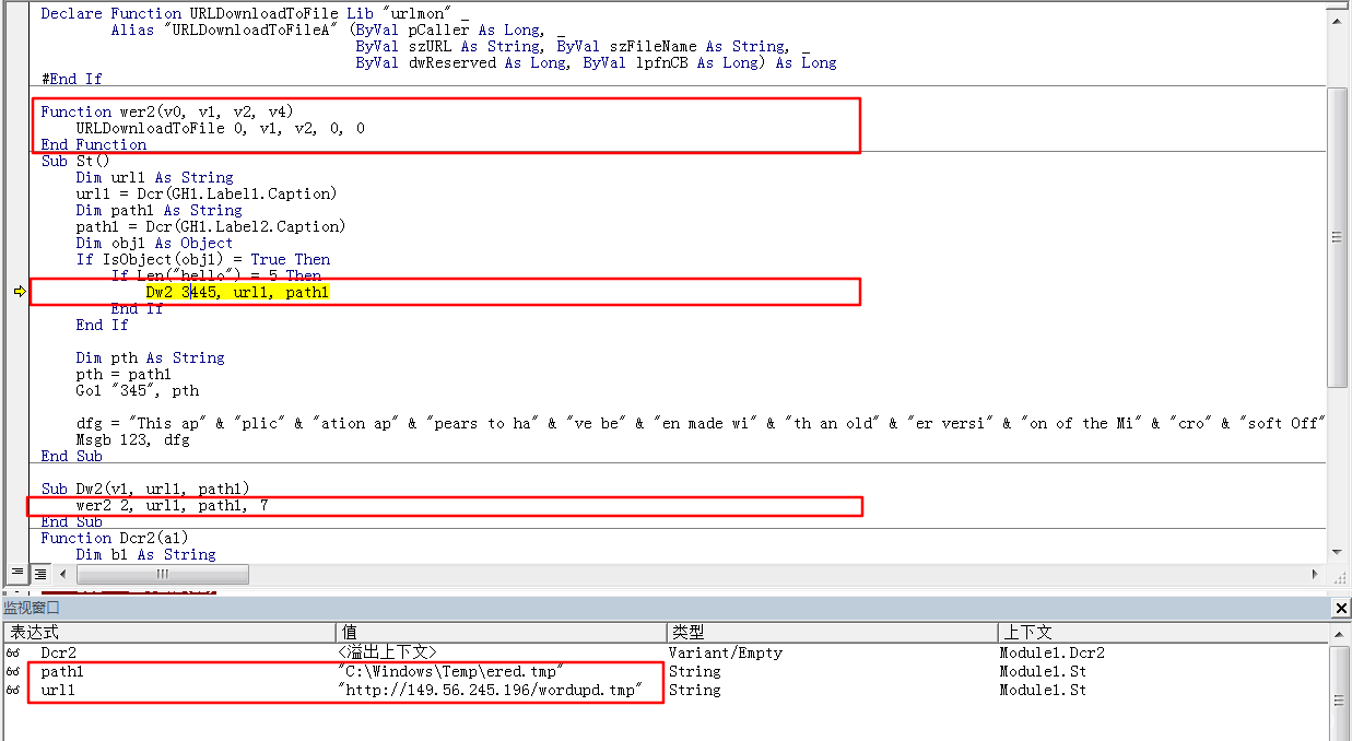 宏代码解密窗体中的数据,然后从远程服务器hxxp://149.56.245.196/wordupd.tmp 下载恶意程序到C:WindowsTempered.tmp,然后执行恶意程序,如下所示: