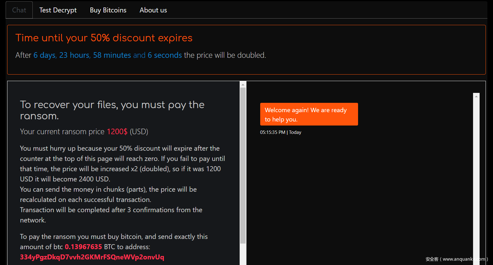 勒索赎金为:0.13967635 BTC,相当于1200美元,过期翻倍,我去!现在搞勒索都这么黑的,上次还是400美元,这次直接1200美元了,黑客的BTC钱包地址: