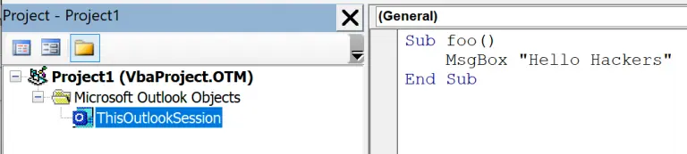 与大多数Microsoft Office产品套件一样,Outlook可以启用developer选项卡,并通过VB编辑创建基于VBA的宏。打开编辑器并创建一个简单的宏,你会发现一个名为“ThisOutlookSession”的Outlook特定模块: