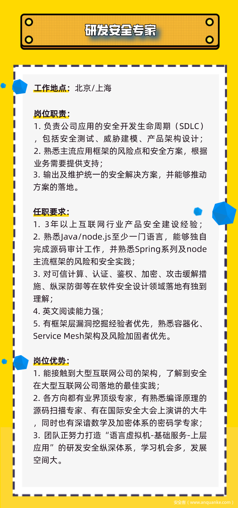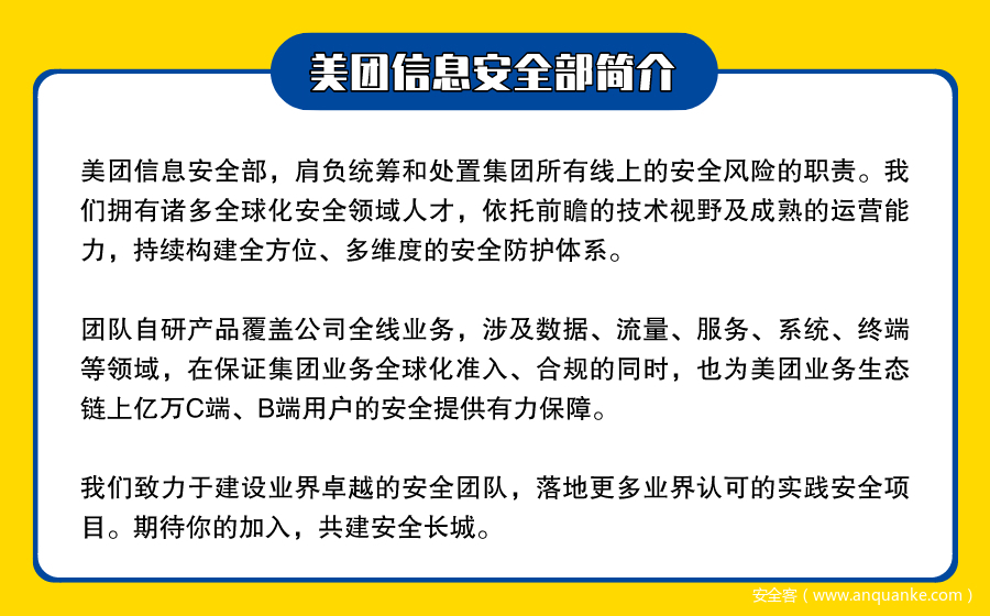 目前团队正在努力打造语言虚拟机—基础服务—上层应用的纵深应用安全体系,急需对研发安全感兴趣的同学加入!如果你正好有求职意向且满足以下岗位要求,欢迎投递简历至sunny.fang@meituan.com(邮件主题请注明:【研发安全专家-城市-美团SRC】)。