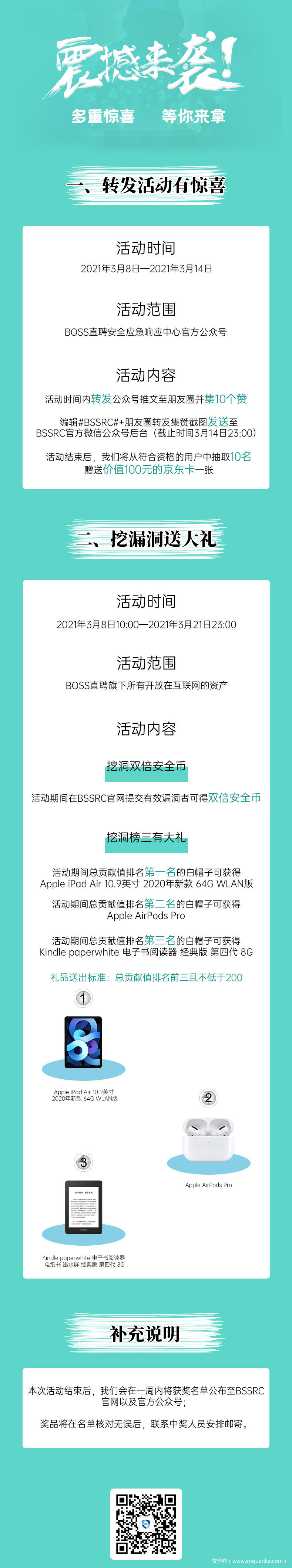 BOOS直聘安全应急响应中心上线之际,平台诚意满满,多种活动火热来袭,话不多说,看下文~