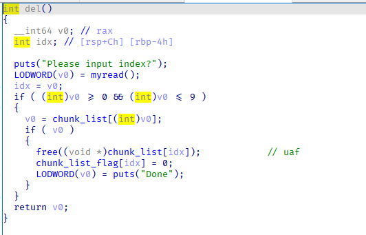 程序的主要漏洞就出在释放函数中,可见函数并没有检查 chunk_list_flag,且释放后并没有将 chunk_list置0,存在uaf