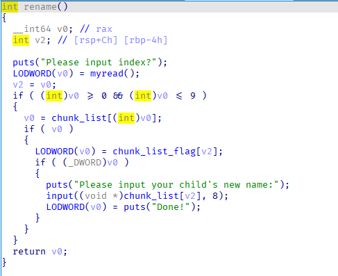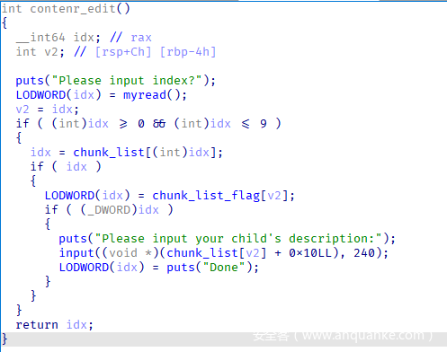 如图可以看出程序最多可以申请10个堆块,同时会维护两个数组,分别是chunk_list和chunk_list_flag, 其中前者储存申请的chunk地址,而后者则会依据申请堆块的序号把数组对应位置写为1
