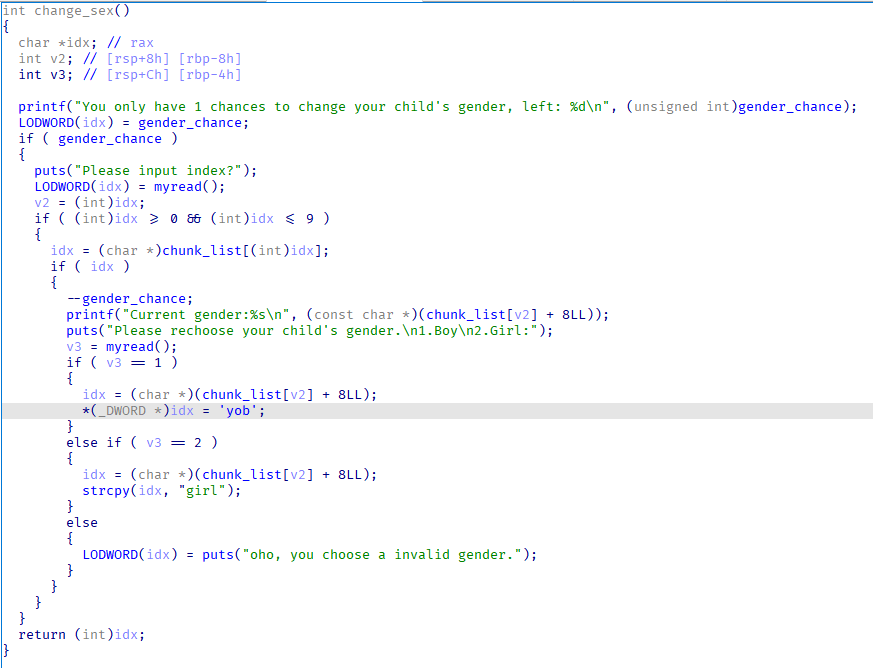 这个函数就不太一样了,他在修改性别前没有检查chunk_list_flag,而且会先打印当前性别