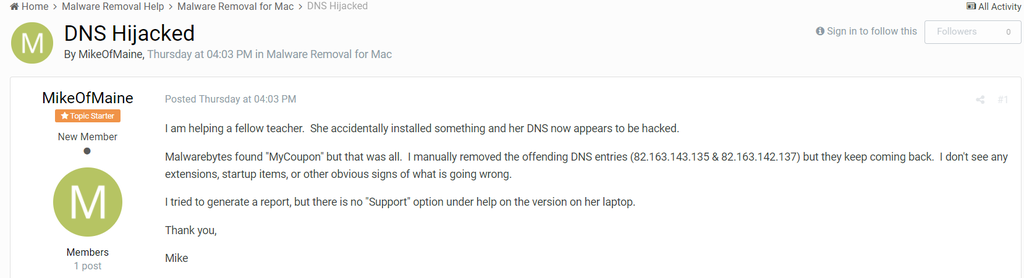 这个恶意软件的信息最早出现在malwarebytes的论坛上(一个网友不小心安装了什么然后他的DNS就被篡改了)