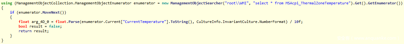 第6种技术会检查系统当前的CPU温度(MSAcpi_ThermalZoneTemperature条目)。事实上某些hypervisors(VMWare、VirtualBox以及Hyper-V)并不支持温度检查功能。WMI请求只会简单地回复“不支持”字样。这种逻辑可以用来检测目标系统是否为真实的主机环境。