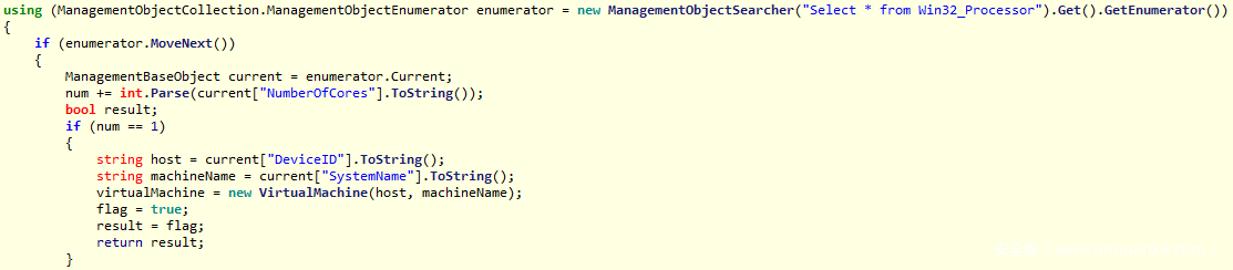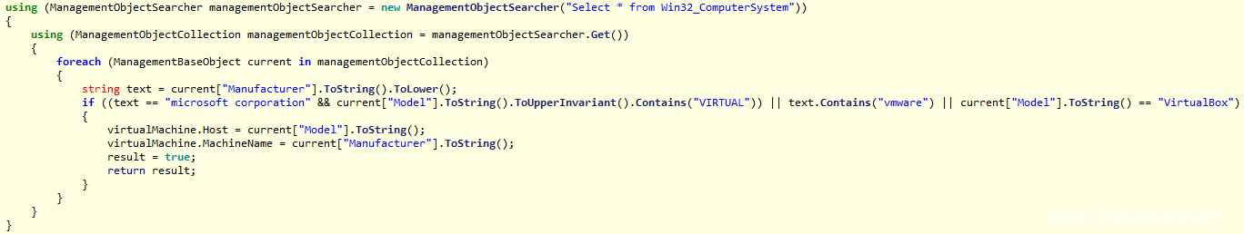 第3种技术使用了WMI中的Win32_Computer,检查生产商是否包含“VIRTUAL”、“VMWARE”或者“VirtualBox”字样。