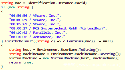 最后一种技术用到了目标系统的MAC地址信息。如果MAC地址以某些常见的十六进制数字开头,则将目标系统识别为虚拟机。