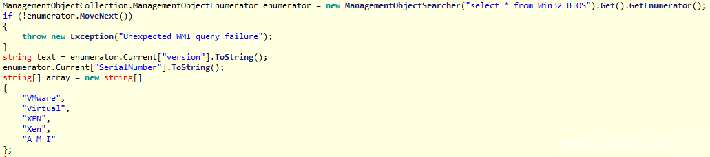 第2种技术使用了WMI请求来获得BIOS版本信息(Win32-BIOS)。如果返回的信息包含“VMware”、“Virtual”、“XEN”或者“A M I”,则认为当前系统为虚拟机环境。此外,恶意软件会检查BIOS的序列号以及具体版本。