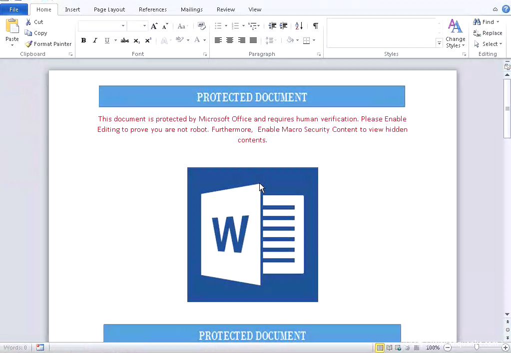 恶意软件开发者构造的恶意文档大多为Microsoft Office Word文档。攻击者使用嵌入式宏在受害者系统上执行命令。当受害者打开恶意文档后,将看到如下界面: